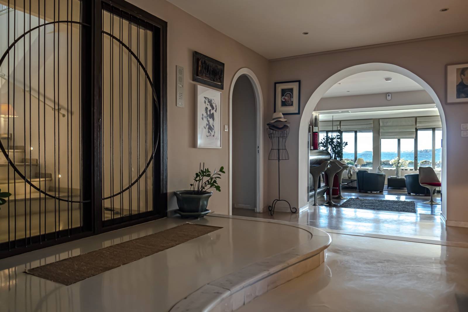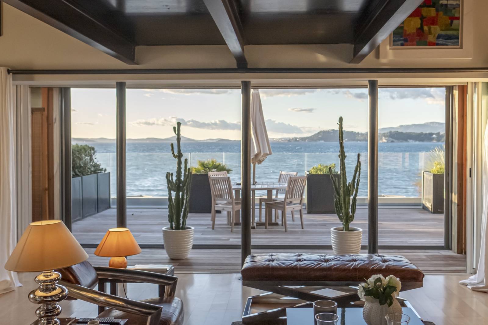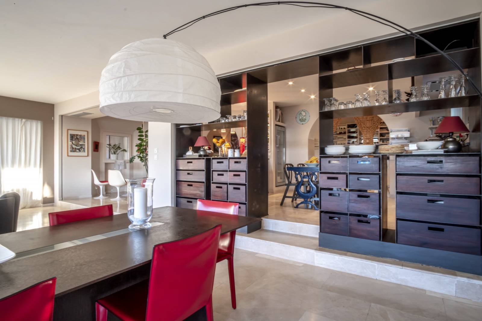 Métal, cuir, marbre, Inox poli ; l’intérieur se veut chaleureux et sophistiqué. Un espace tout confort volontairement déconnecté de l’intérieur en forme de contraste face à la brutalité du milieu.