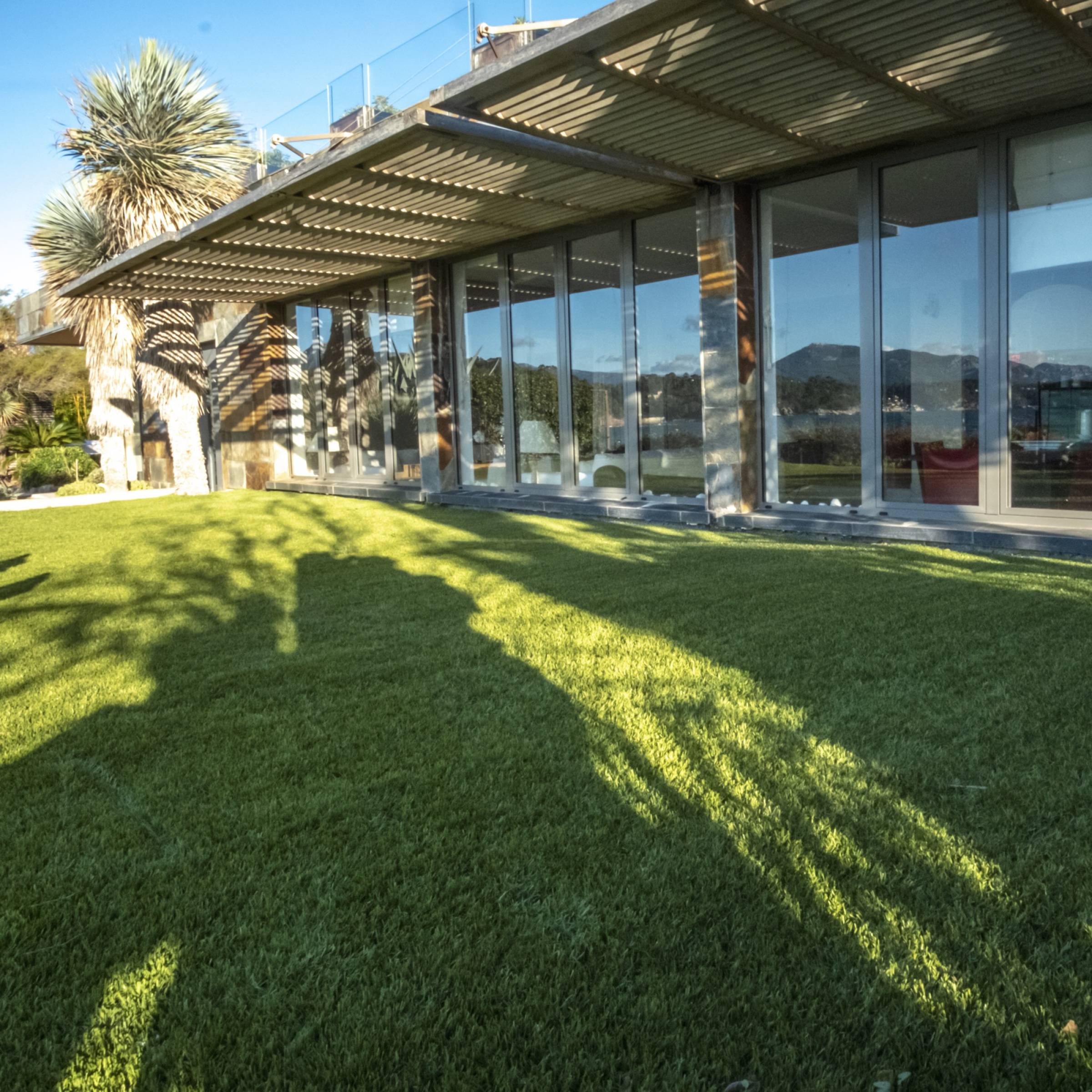 Mais au bord de l’eau il était aussi intéressant de développer un second axe de vue et de pratique enfin d’enrichir l’espace et l’aspect luxueux de la villa. Ainsi, une grande piscine partant de l’intérieur de la maison permet de porter le regard au bout du jardin. .