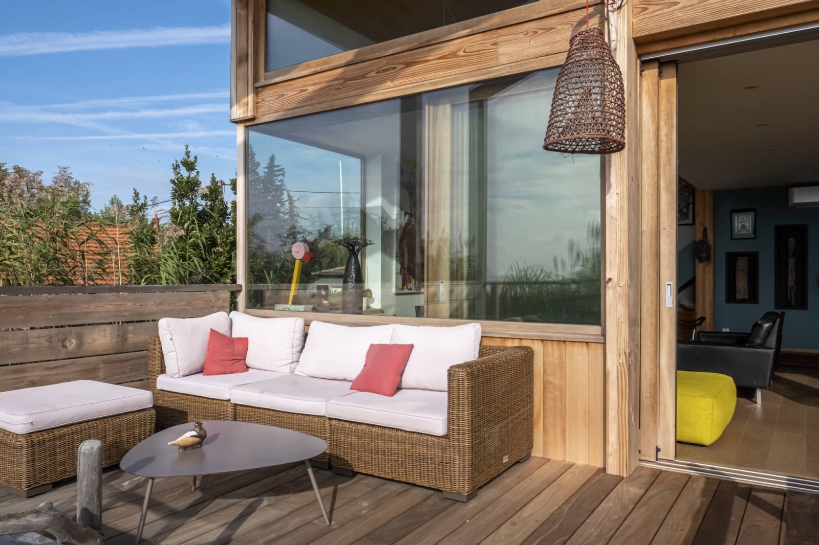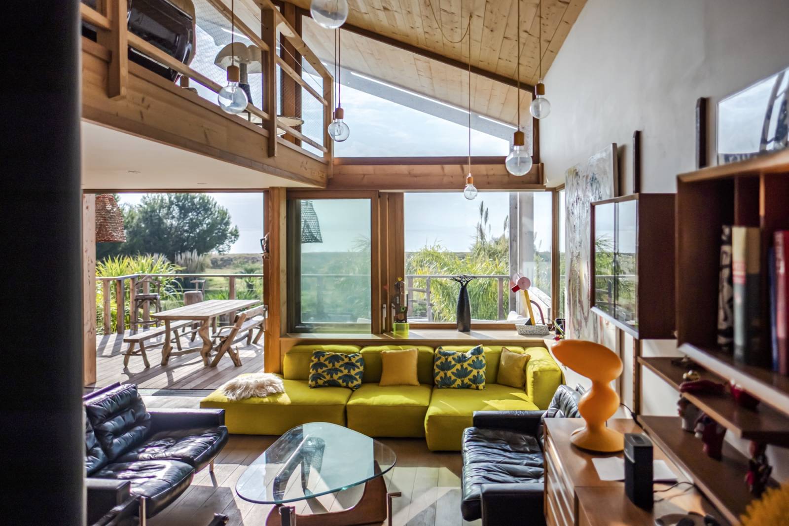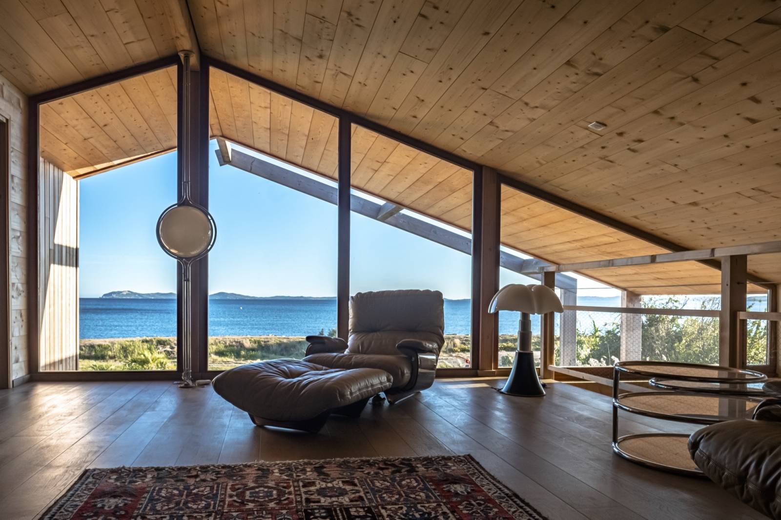 La double hauteur qui assure une belle transparence entre l’extérieur et l’intérieur maximise les points de vue en tous points de la maison.