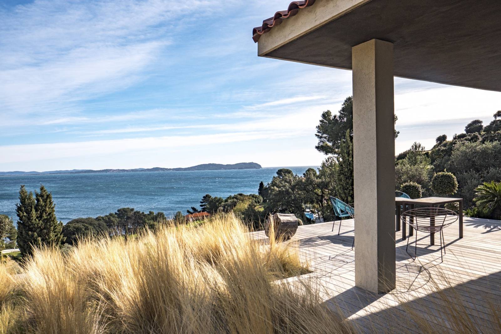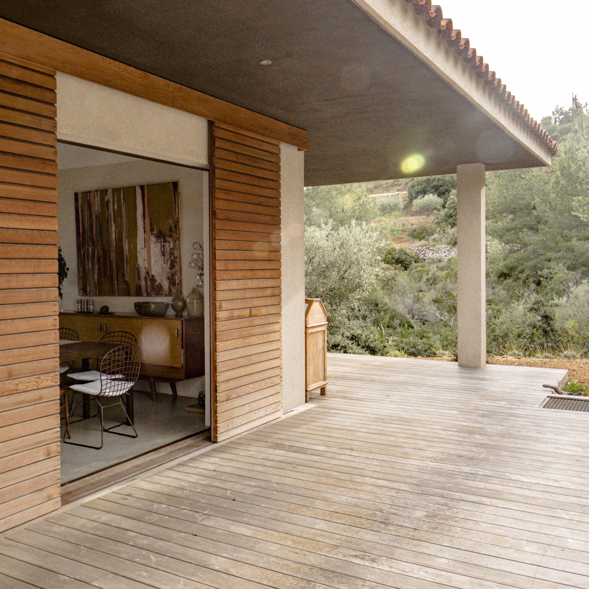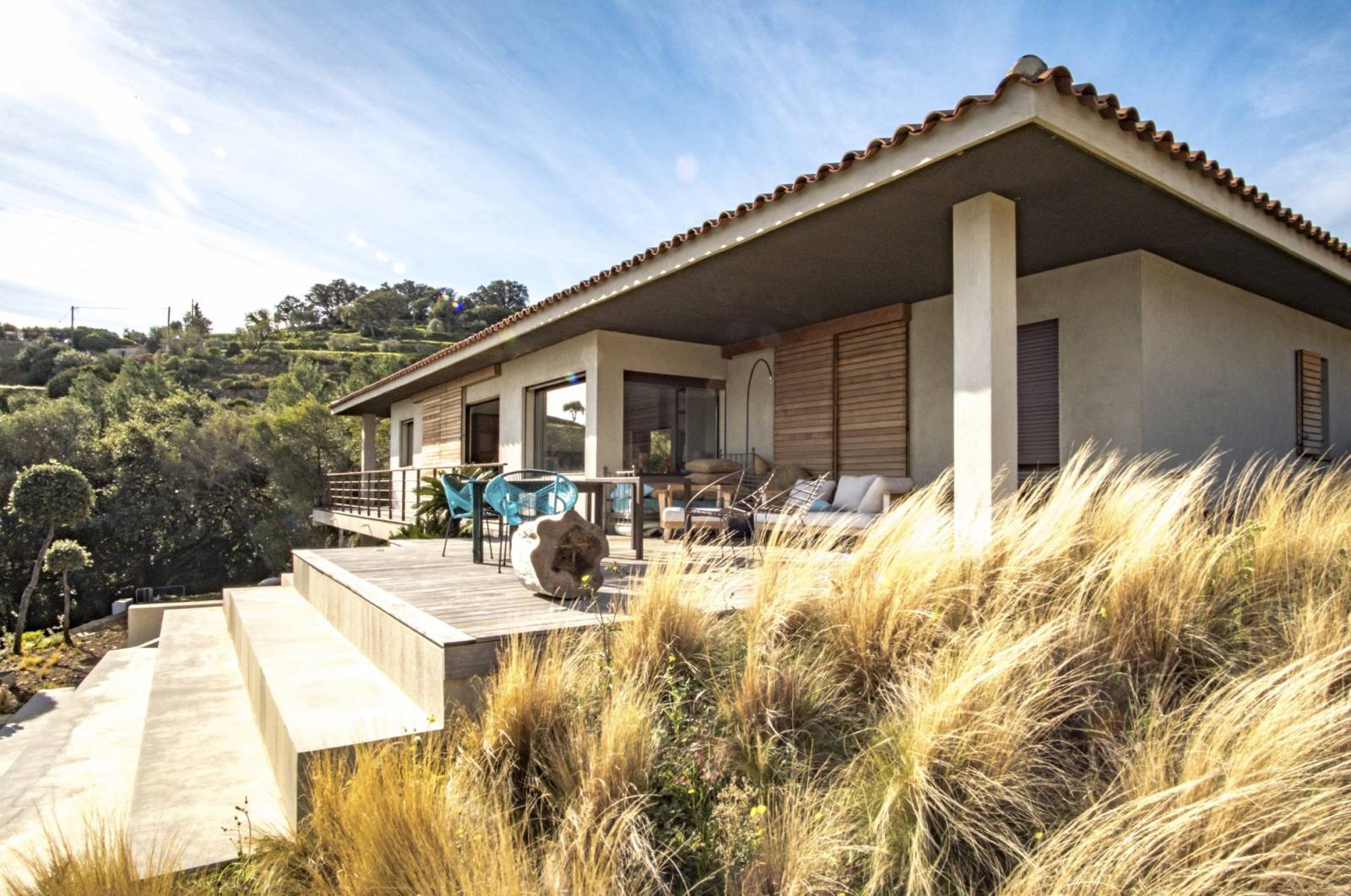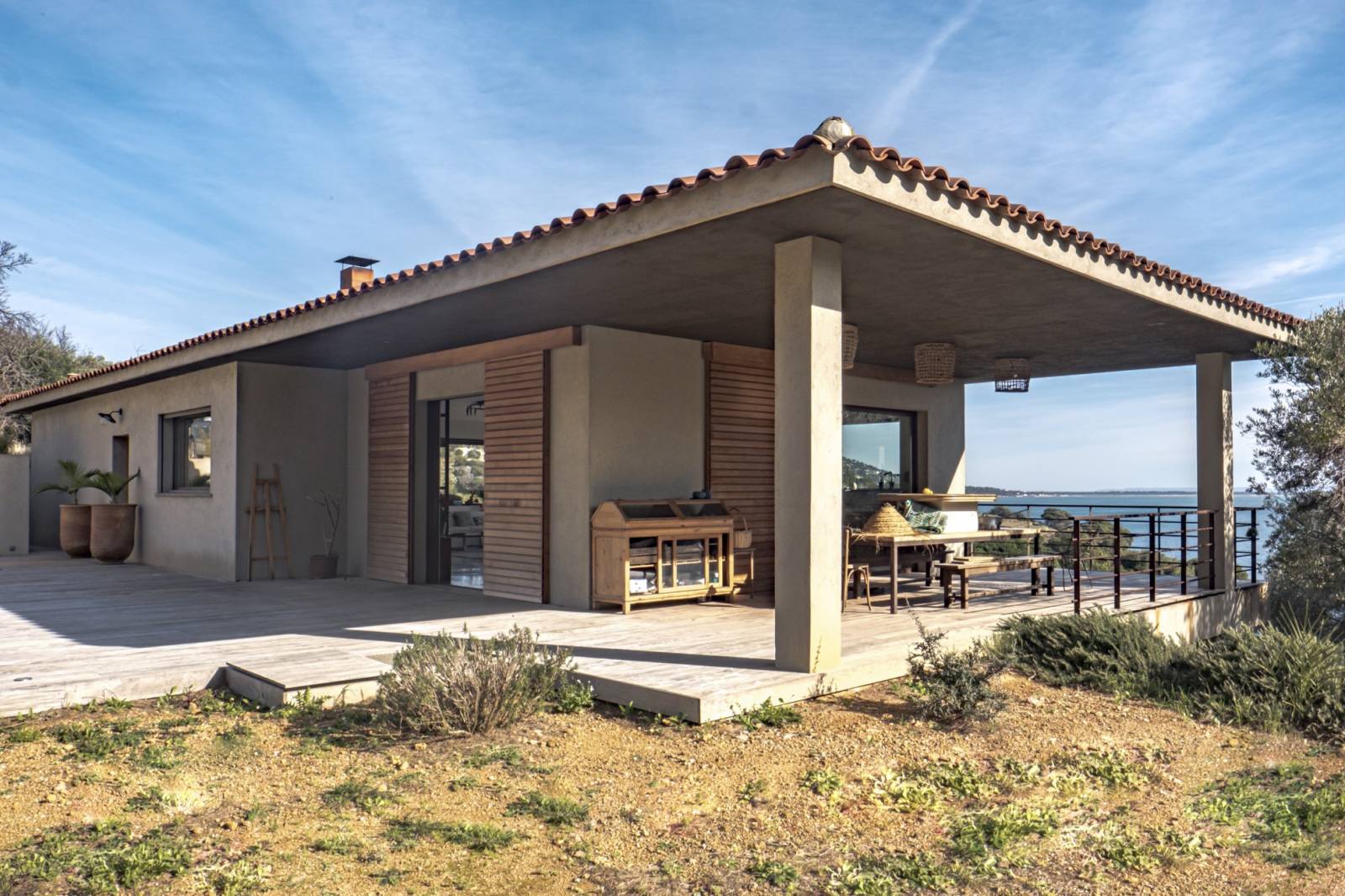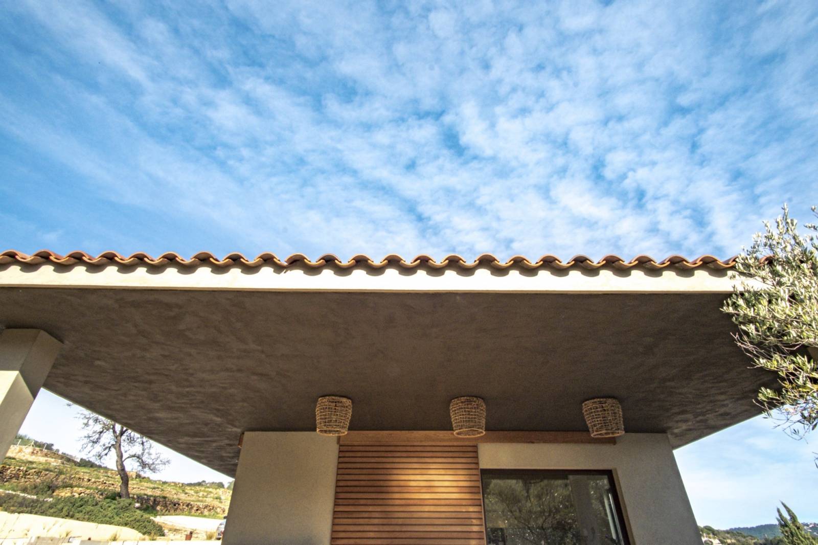 La « dolce vita » c’est l’art de vivre librement en harmonie avec la nature. De toute part l’environnement naturel doit donner l’impression de pénétrer les lieux. La sous face de la toiture est en « stucco » brun foncé .