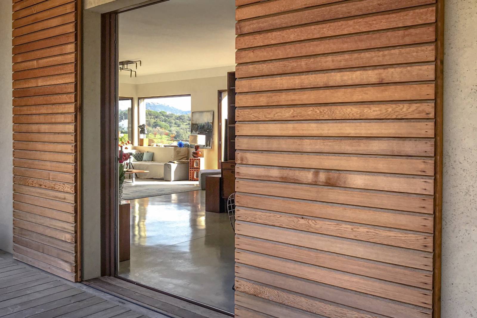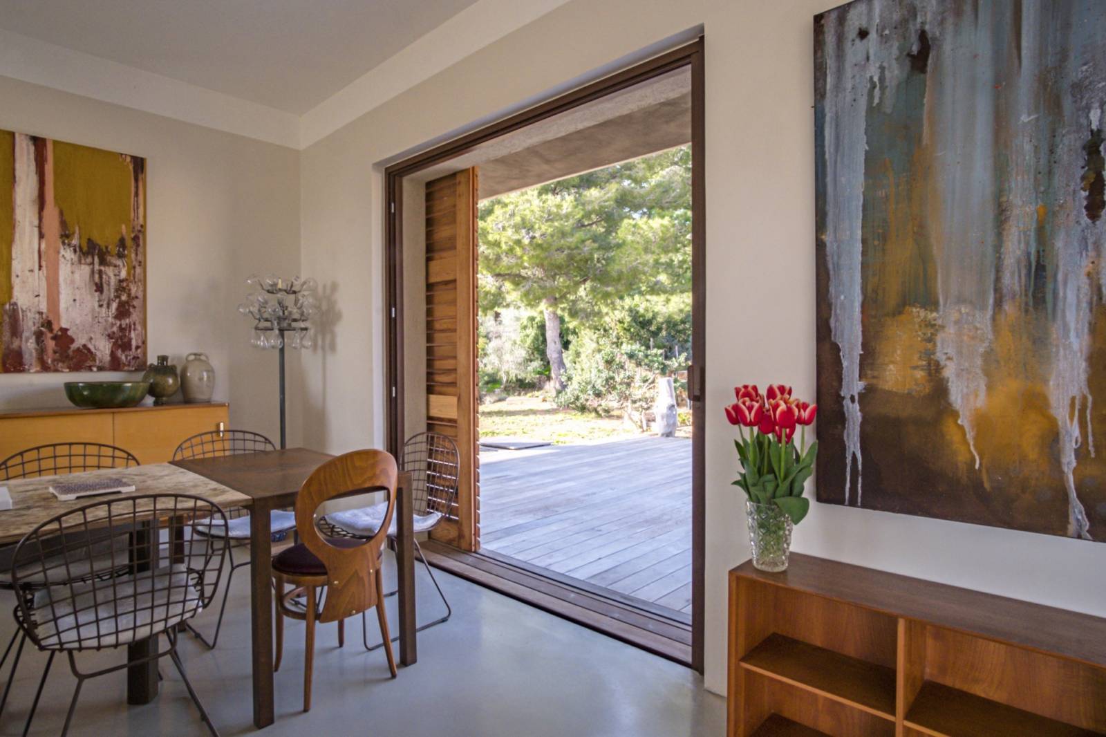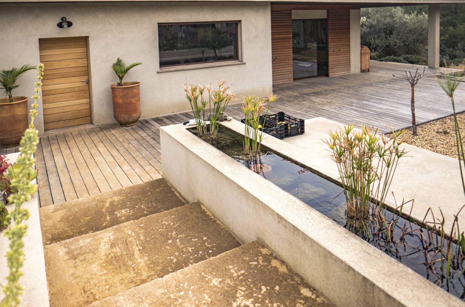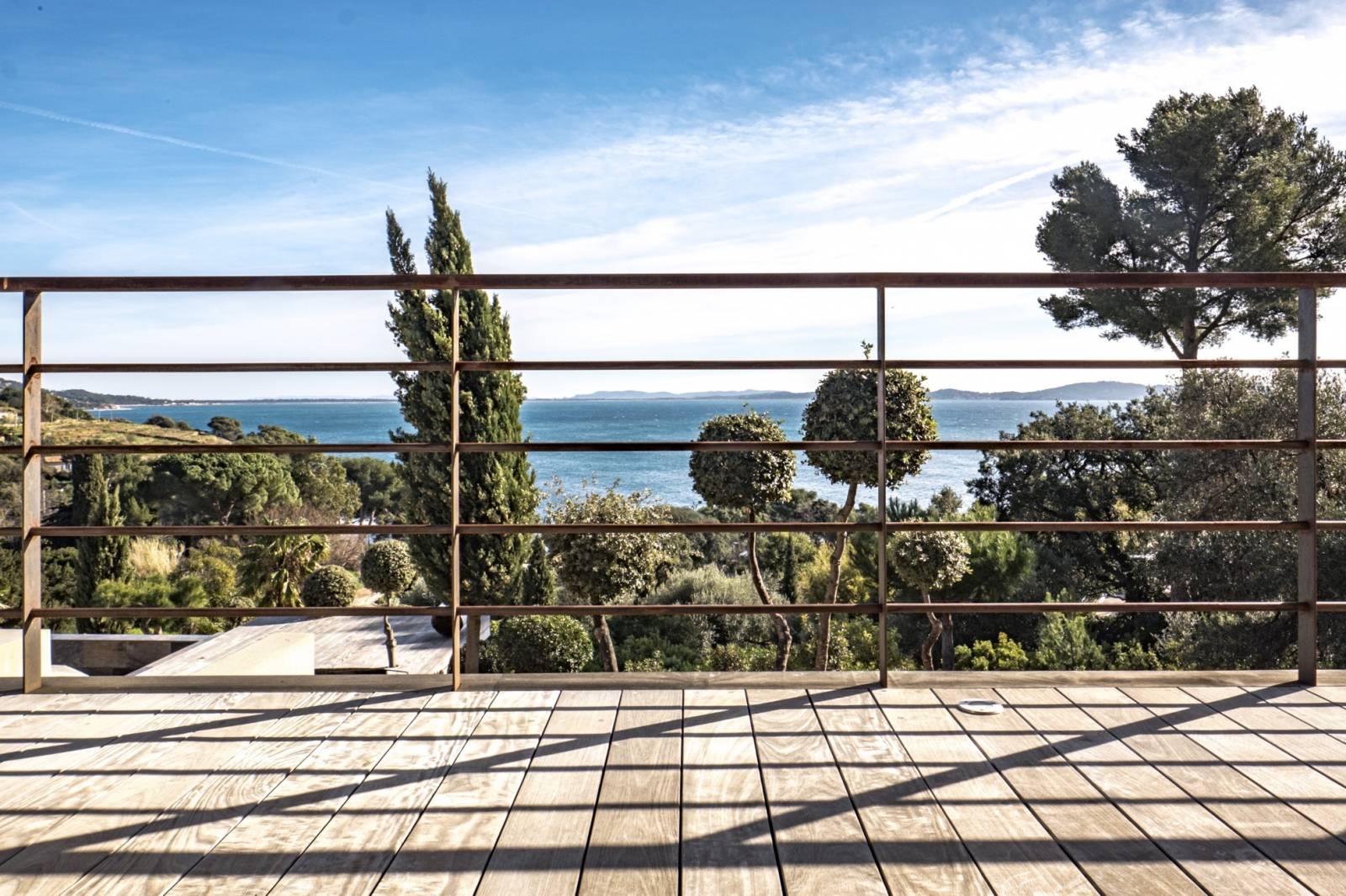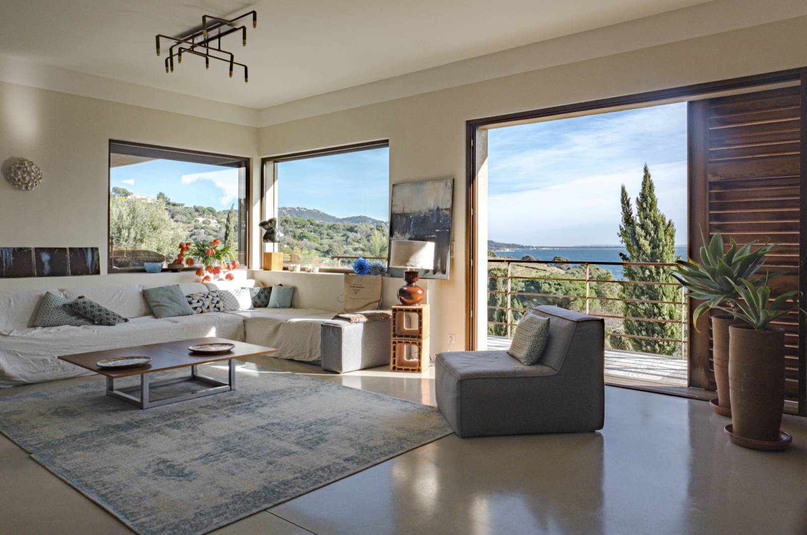 La « dolce vita » c’est l’art de vivre librement en harmonie avec la nature. De toute part l’environnement naturel doit donner l’impression de pénétrer les lieux. La sous face de la toiture est en « stucco » brun foncé .