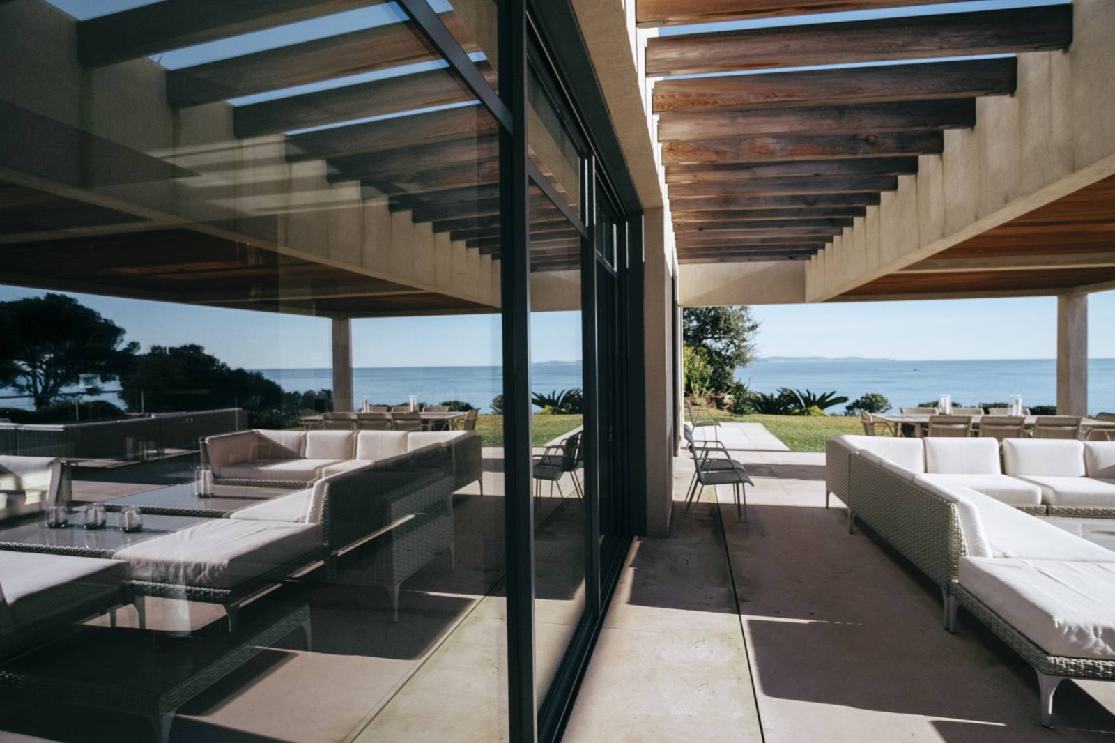A l’intérieur, la décoration est très épurée, un seul sol très clair en pierre de Bourgogne, meubles bois intégrés et désignés par l’agence, mobilier extérieur style international.