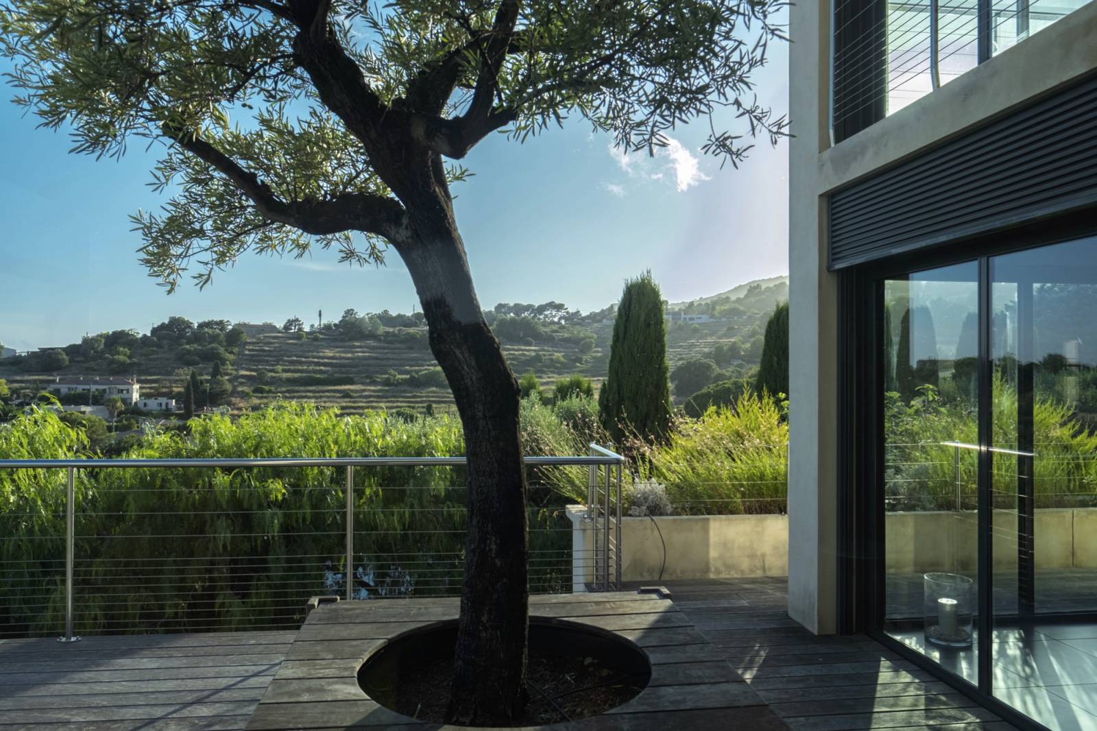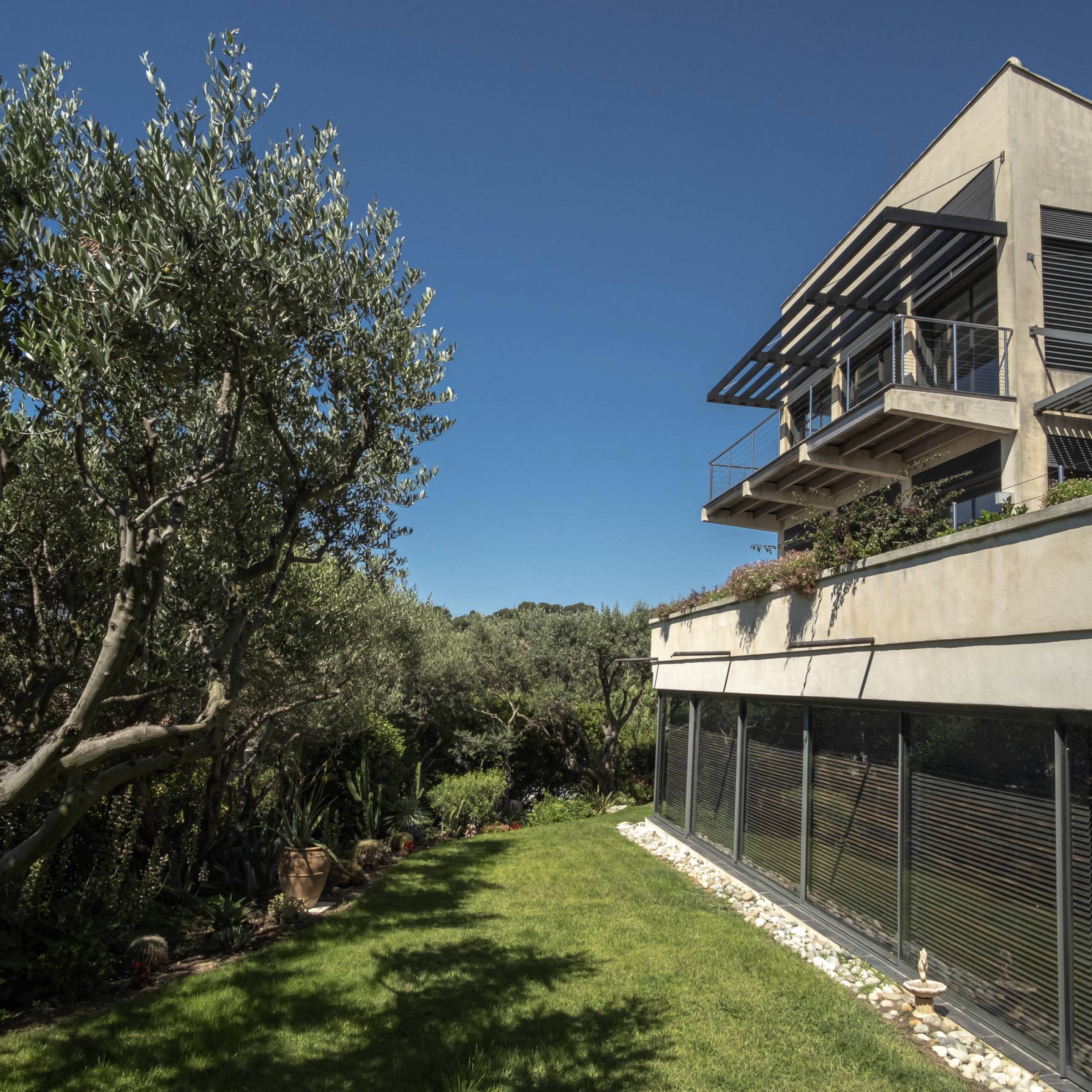 Sur un terrain en longueur, face à la mer, nous avons disposé la maison en équerre afin de permettre le plus d’ouvertures possibles sur la méditerranée mais aussi créer un espace extérieur de vie protégé comme une alternative à la surexposition de la vue.