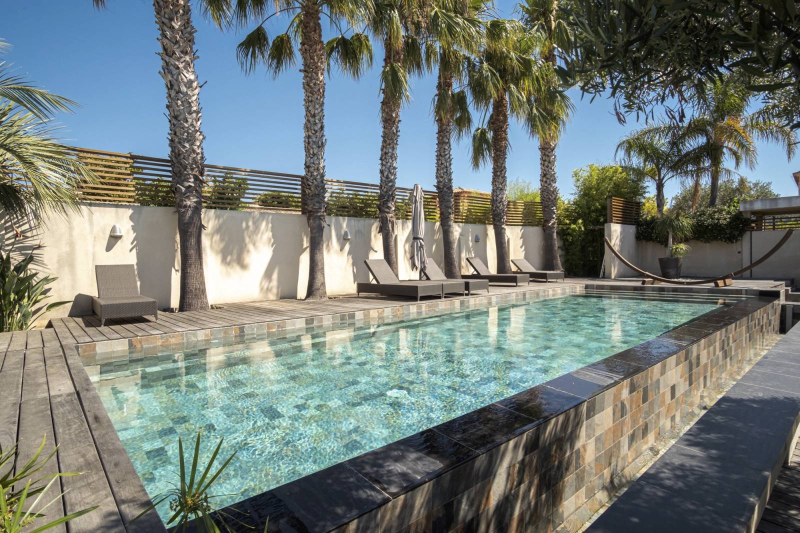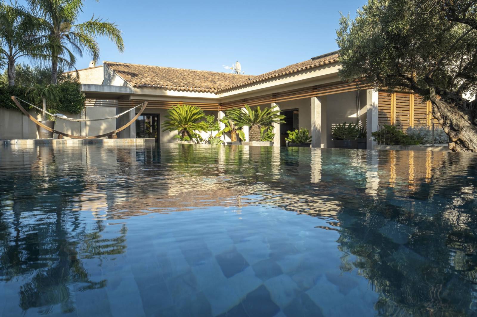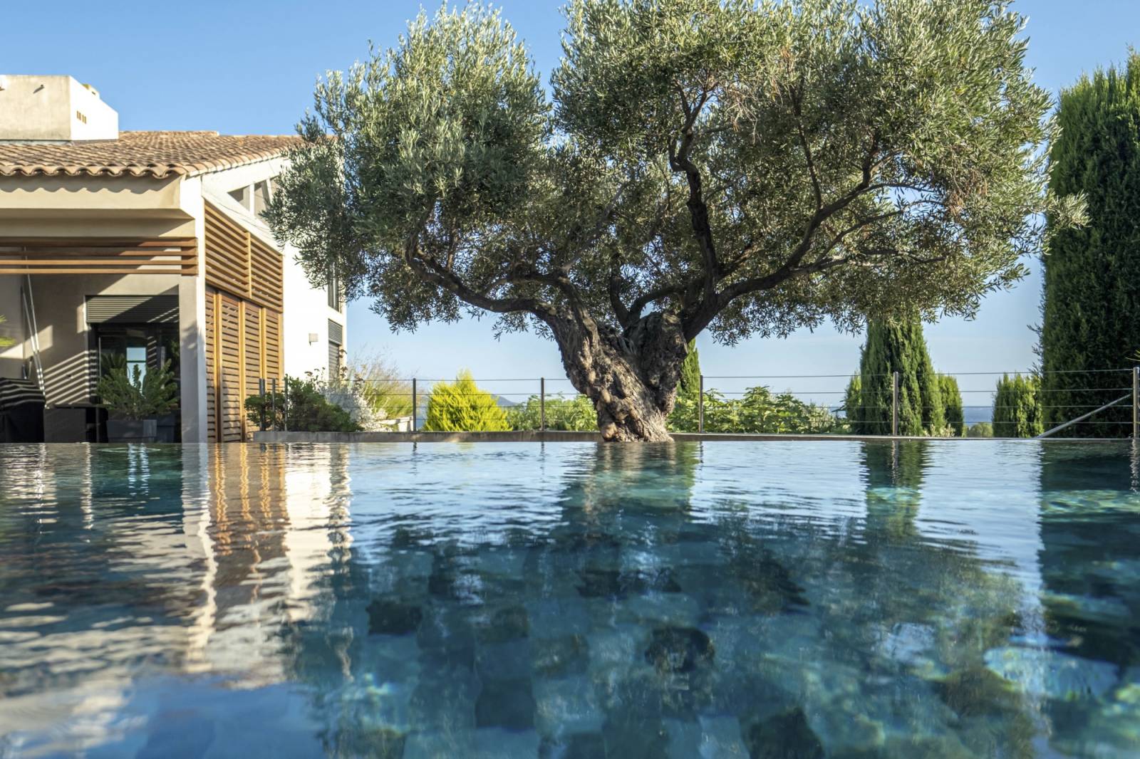 Le patio dont le sol est traité en calade accueille une piscine à débordement en arrière-plan comme un effet miroir qui reflète l’omniprésence depuis l’intérieur.