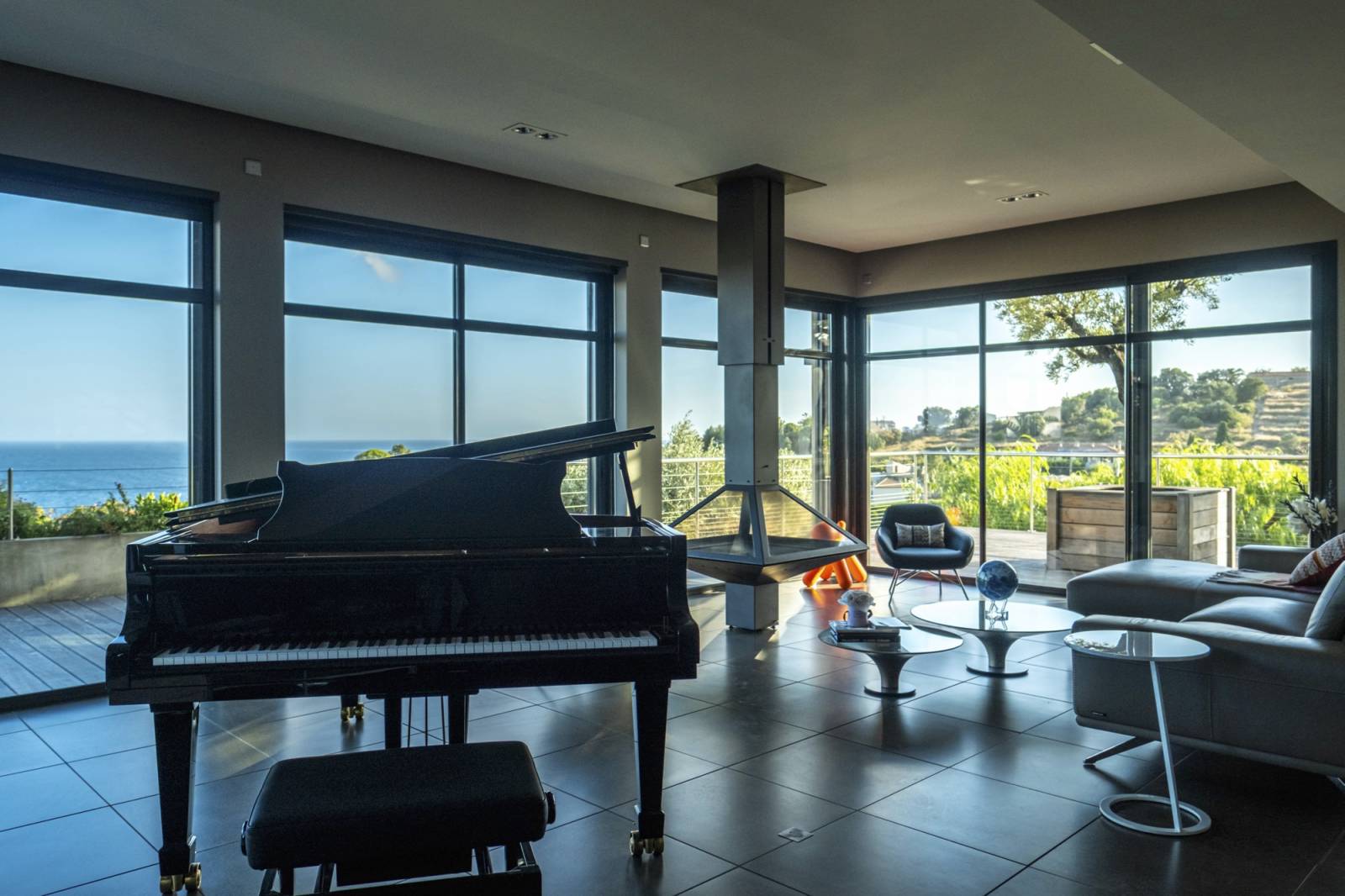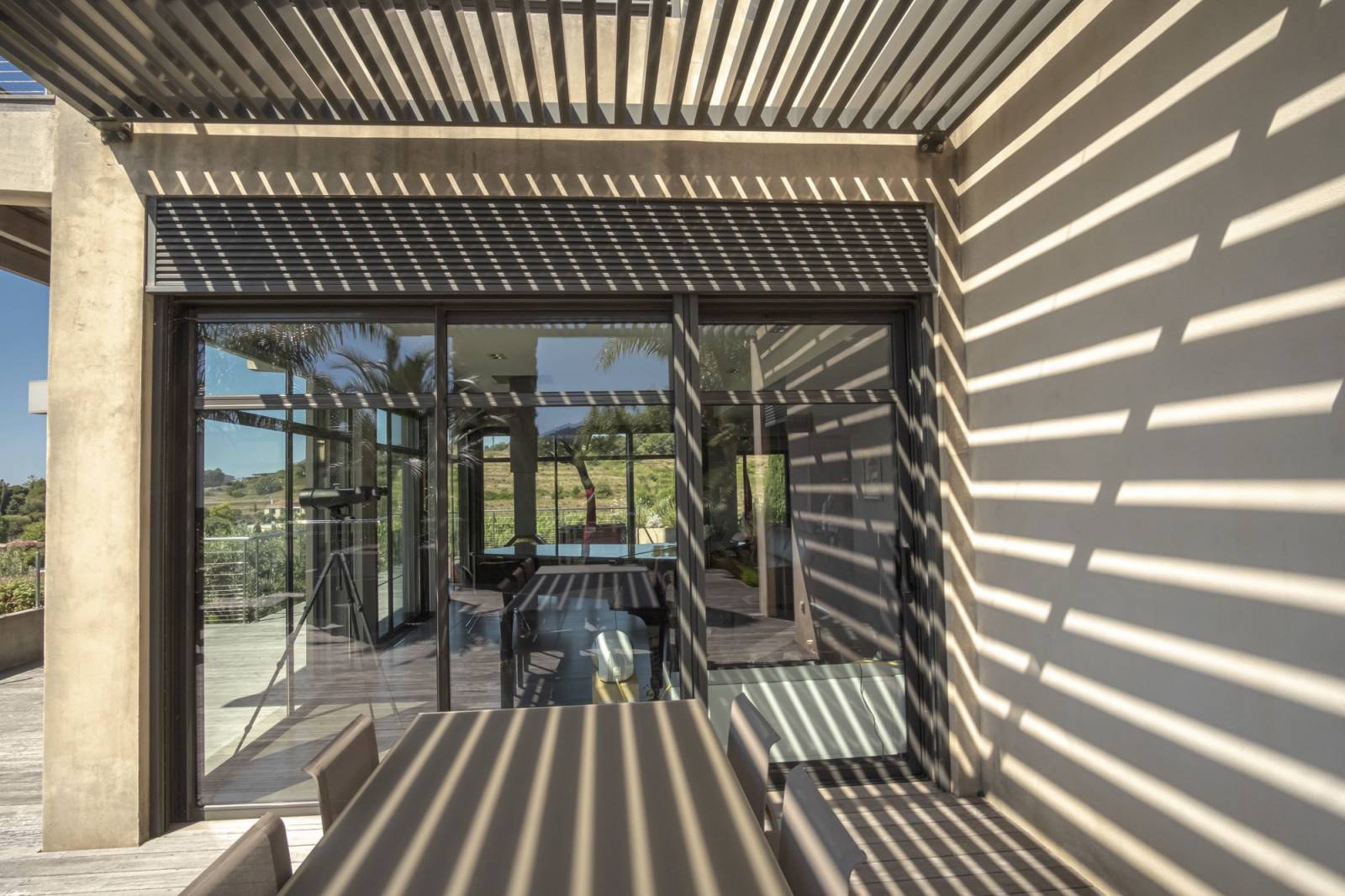 éléments de la maison au spectacle du paysage. Le vocabulaire architectural de la maison est très contemporain, composé de métal et de verre afin de maximiser les sensations de transparence et de légèreté.