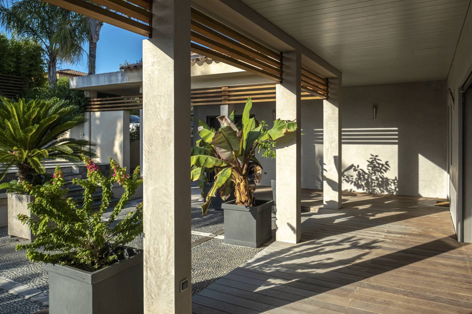 Cependant une identité balnéaire forte est donnée à la maison grâce à l’apport de brises soleil, pergolas bois volets bois et gardes corps inox.