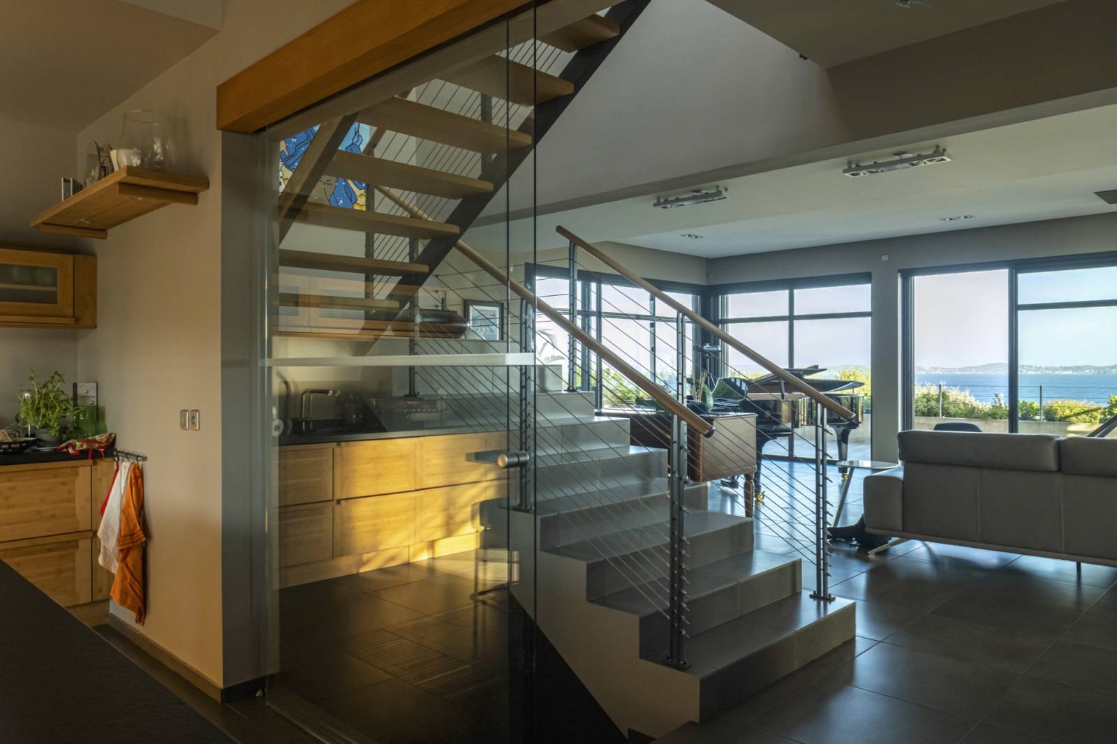 La décoration intérieure est très contemporaine, carreaux grés Céram anthracite grands format, parois vitrées galandage, escaliers métal, main courante inox, façades en bambou pour la cuisine.